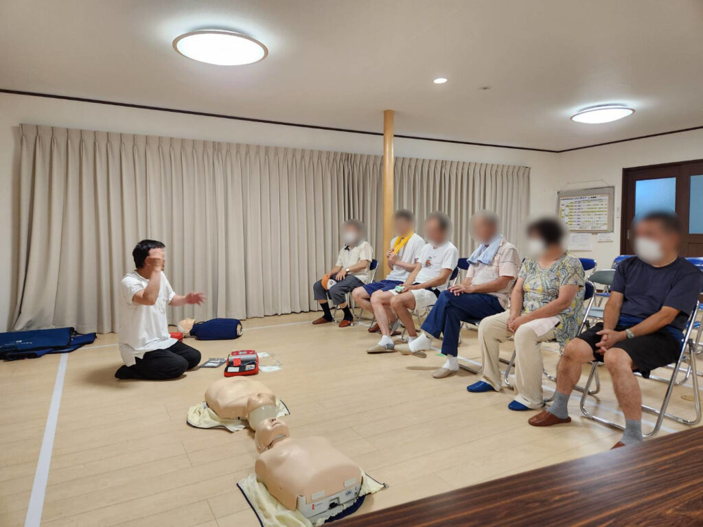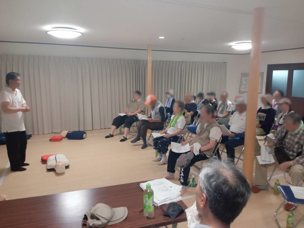 一次救命処置(心肺蘇生とAED)を住民の皆さまに身近に知って頂くための「一次救命処置の体験会」を、前回の6月に引き続き2024年8月4日集会所で開催しました。